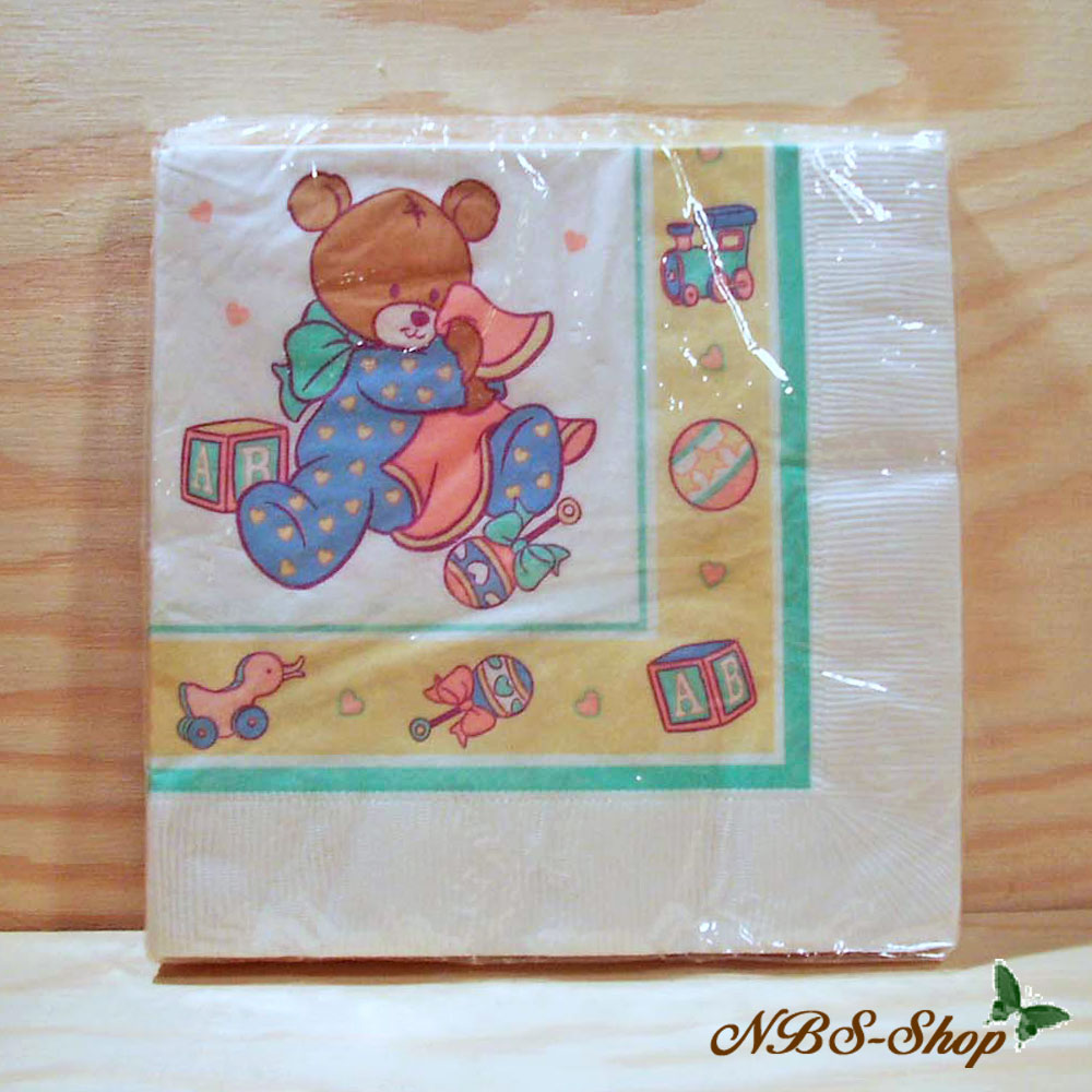 Zum Pappgeschirr passende Servietten mit süssem Bärchen und Kinderspielzeug bedruckt.