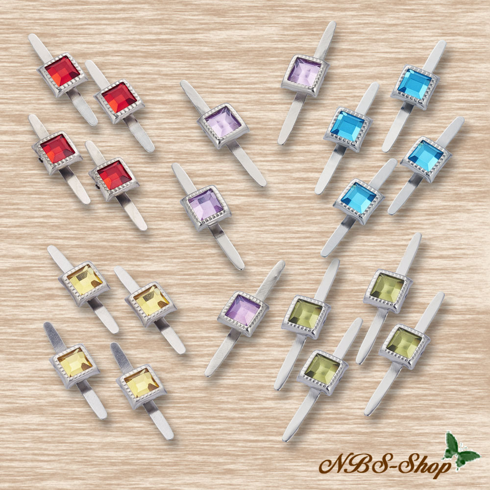 Silberfarbene, rechteckige Verschluss-Klammern mit einem farbigen Schmuckstein in der Mitte.