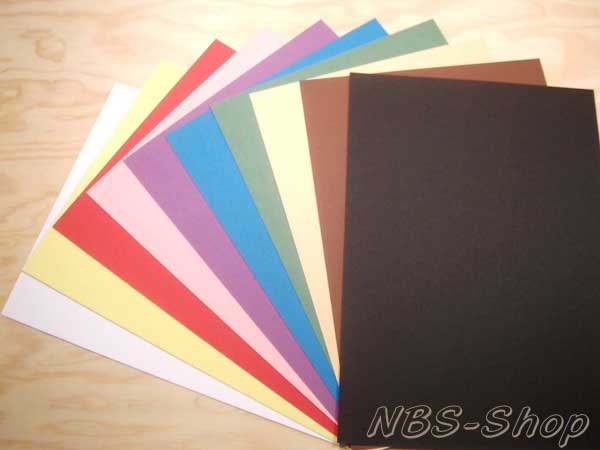 DIN A4 300 g/m² sortiert in den Farben: weiß; gelb; rot; rosa; lila; blau; grün; braun; grau und schwarz. Farbtöne können variieren. Einzelfarben oder eigene Farbzusammenstellung auf Anfrage