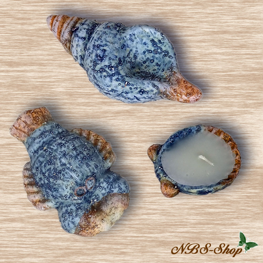 Das Set besteht aus einer gedrehten Schnecke, einer Hummer-Figur und einer Muschel-Kerze