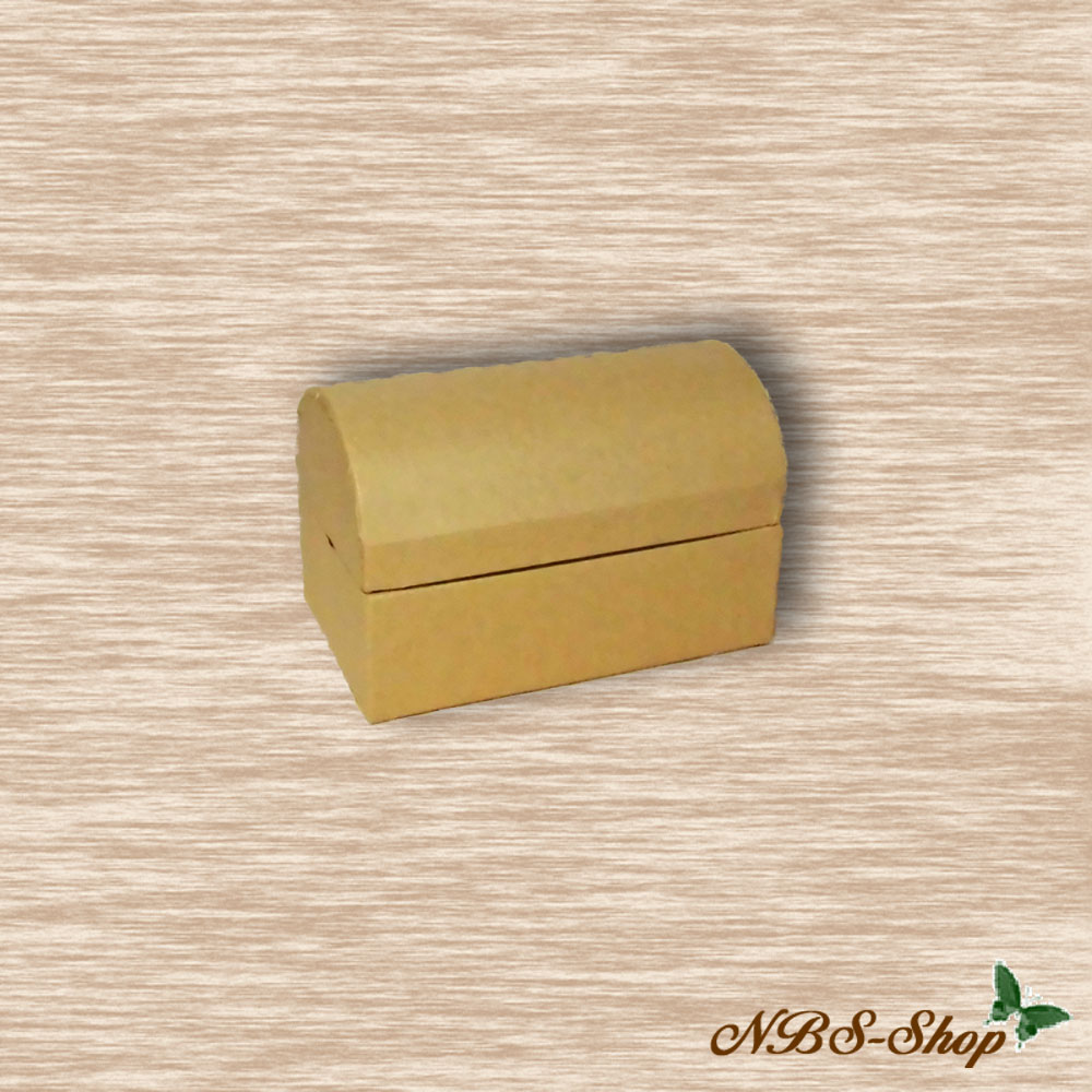 Die Papp-Truhe hat an einer Seite ein braunes Bändchen, welches den Deckel fixiert.